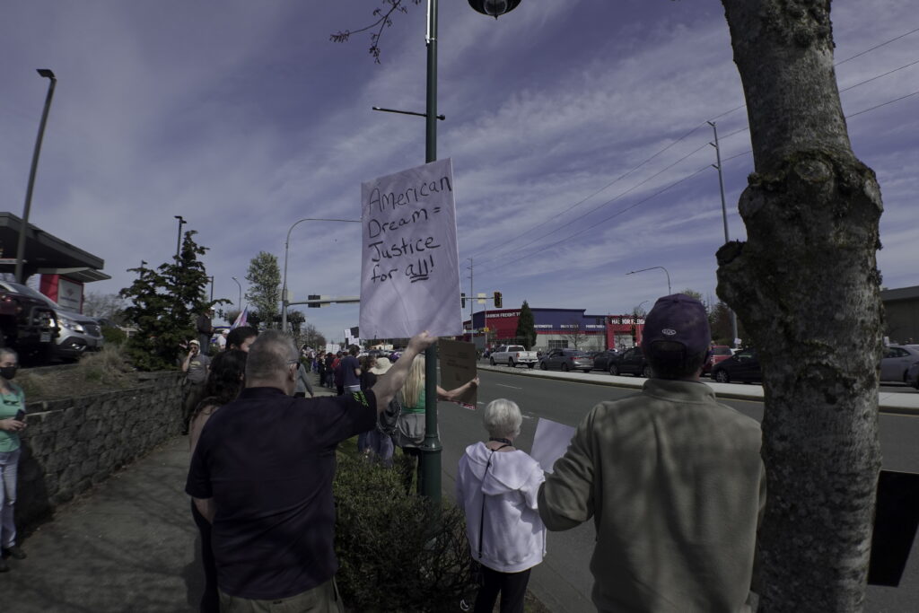 Over 730 protesters lined the busy intersection of South 320th Street and Pacific Highway South in Federal Way, WA on a sunny Saturday afternoon, demanding “Hands Off!” various aspects of civic life they feel are under attack by figures like Donald Trump and Elon Musk.