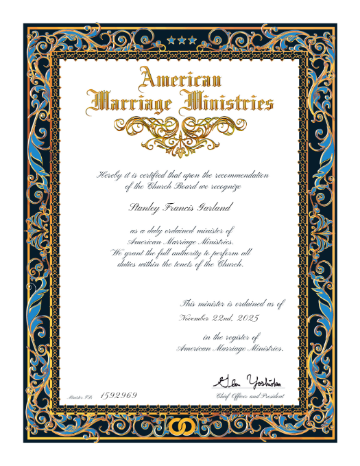 - Ordinations through American Marriage Ministries, Universal Life Church, Open Ministry, The Provenance Center for Ordination, and Spiritual Humanism.