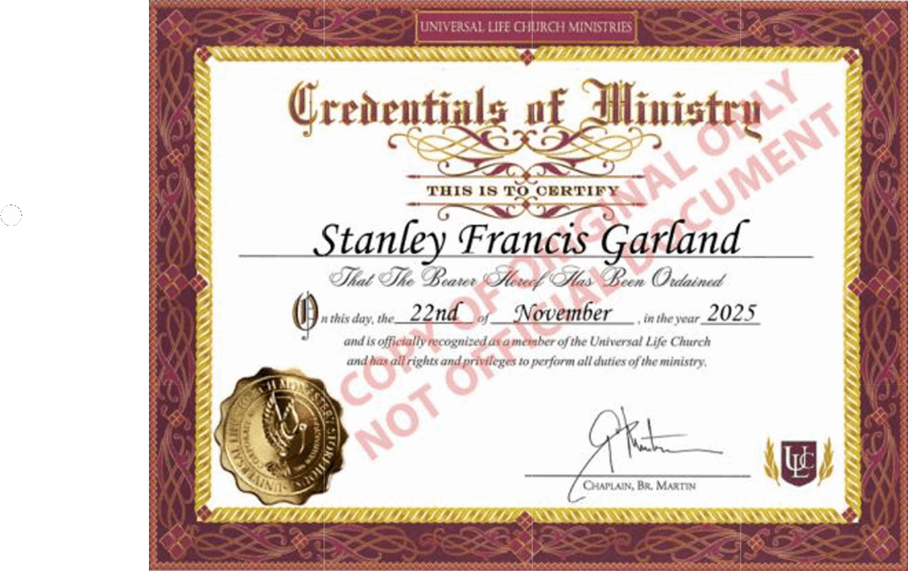 This Ministry is hereby established as a perpetual, sovereign, non-denominational, and inter-ecclesiastical organization. Its authority is derived from a unique and diverse compilation of Holy Ordinations and Academic Honors, establishing its founder as a fully empowered Ecclesiastical Authority and Doctor of Letters, including: