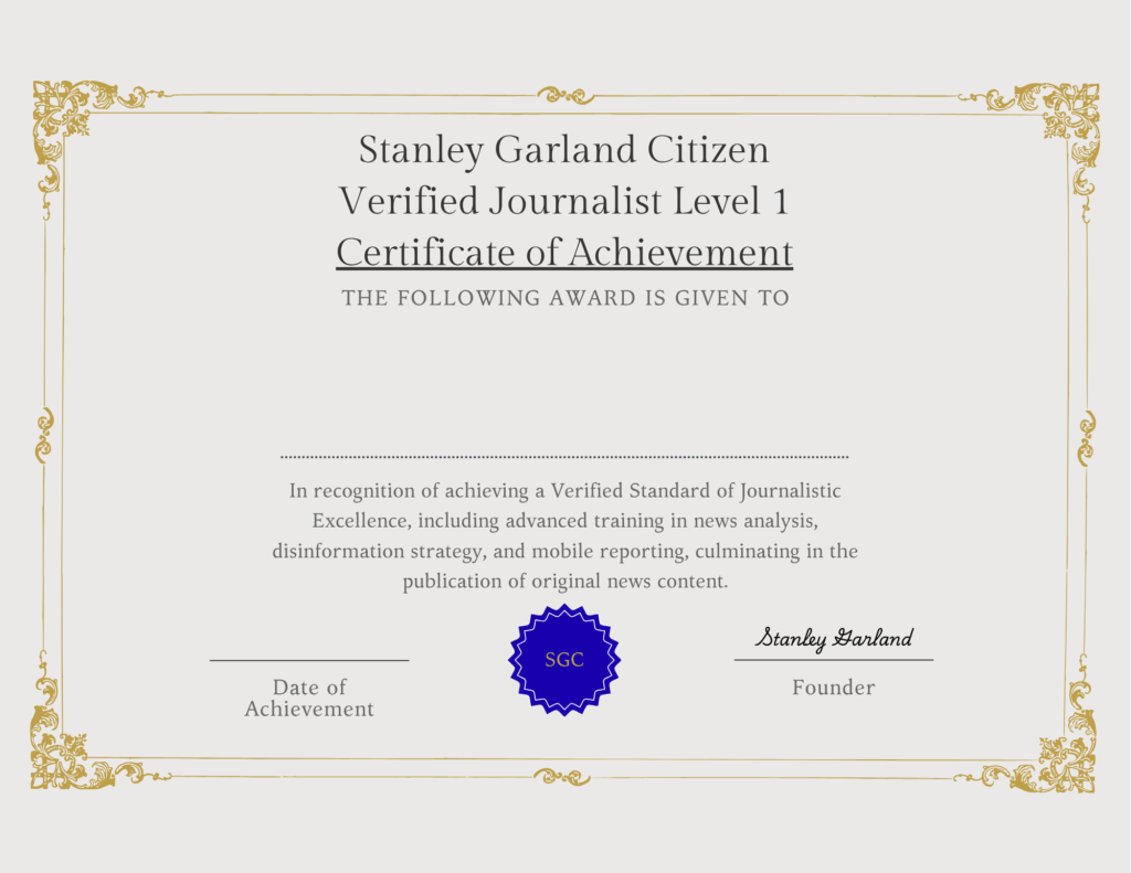 The Stanley Garland Citizen Verified Journalist (SGC-VJ) Standard represents the core commitment of this publication to quality, ethics, and multi-platform media mastery. This tiered achievement is not a public certification course, but rather an internal editorial benchmark reserved exclusively for current and future members of The Stanley Garland Citizen team.
