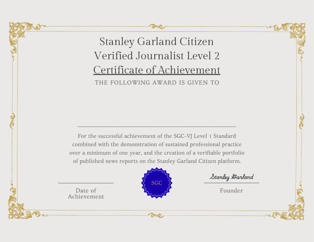 | Level 2 (SGC-VJ2) | Sustained Practice | 1. SGC-VJ1 Prerequisite. 2. Proven Experience: Minimum of one (1) total year of verifiable journalistic experience. 3. Content Volume: Publication of a minimum of five (5) news articles on The Stanley Garland Citizen. |