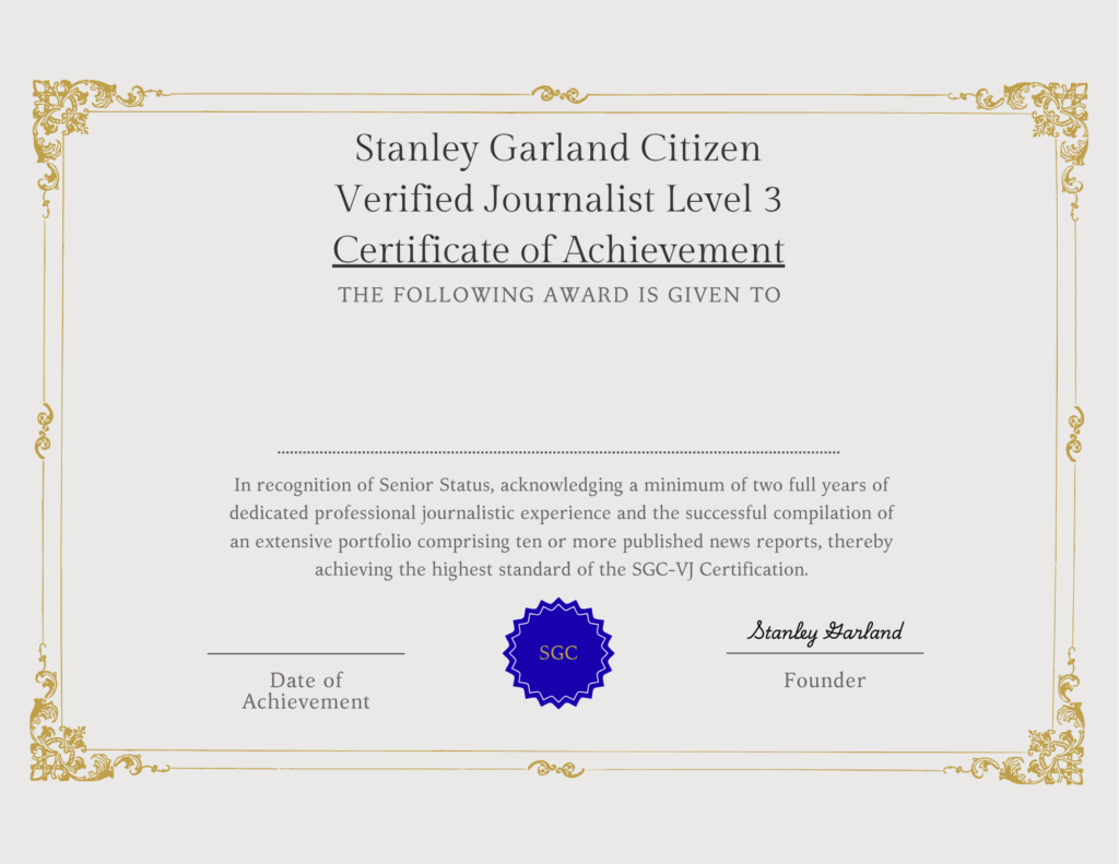 | Level 3 (SGC-VJ3) | Senior Status | 1. SGC-VJ1 Prerequisite. 2. Senior Experience: Minimum of two (2) total years of verifiable journalistic experience. 3. Extensive Portfolio: Publication of a minimum of ten (10) news articles on The Stanley Garland Citizen. |